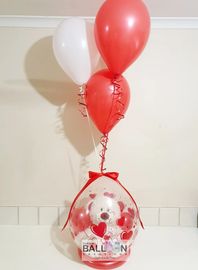 Includes a beautiful white plush teddy bear that stands 34cm tall with metallic ears and heart outlines on his feet with I love you on his belly, a bouquet of helium balloons on top and decorated with a lovely red ribbon.